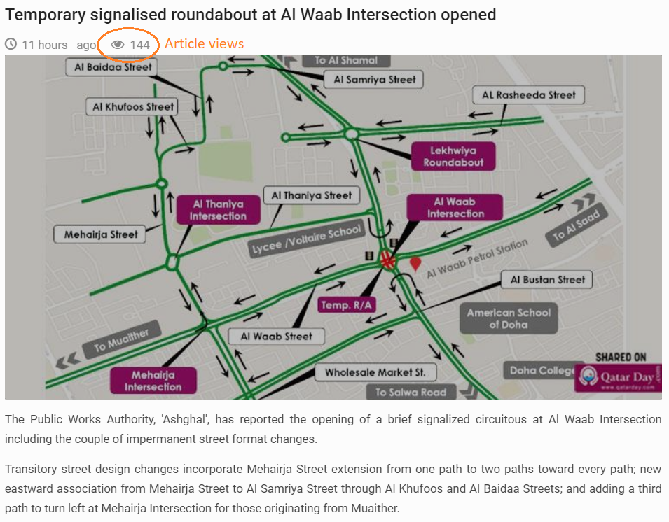 D.) View Counts Some websites like qatarday.com, al-watan.com and alarab.qa among others include information on the number of views individual articles receive. This number displays how many times a page was loaded and while it doesn’t let you know the overall reach, it’s a good way to see how many views articles receive on average and what you actually achieved by having your content placed there.
